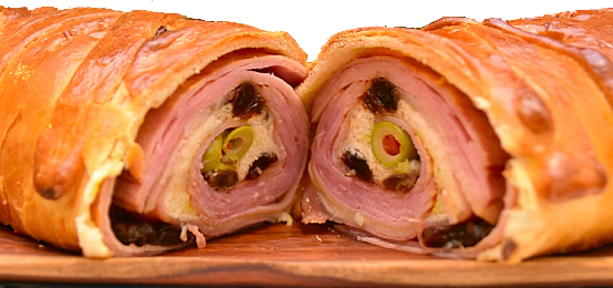 El pan de jamón parece que tiene su origen en Caracas, Venezuela, en la panadería de Gustavo Ramella, en 1905, el primero sólo estaba relleno de jamón, pero tuvo una gran aceptación, surgiendo muchas variantes, poco a poco se hizo muy popular y aunque se toma durante todo el año,  es un imprescindible en la mesa de Nochebuena.
